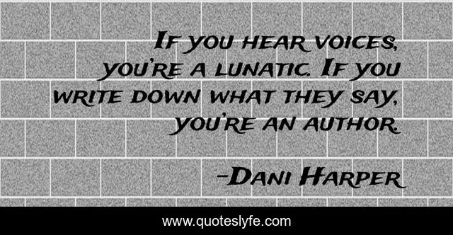 This page presents the quote "If you hear voices, you’re a lunatic. If you write down what they say, you’re an author.". Author of this quote is Dani Harper. This quote is about novelist, author, humor, writing,.