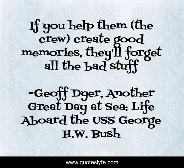This page presents the quote "If you help them (the crew) create good memories, they'll forget all the bad stuff". Author of this quote is Geoff Dyer, Another Great Day at Sea: Life Aboard the USS George H.W. Bush. This quote is about memories, leadership, teamwork,.