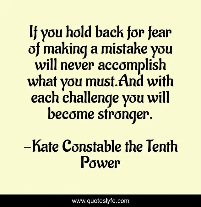 This page presents the quote "If you hold back for fear of making a mistake you will never accomplish what you must.And with each challenge you will become stronger.". Author of this quote is Kate Constable the Tenth Power. This quote is about confidence, magic, fear,.