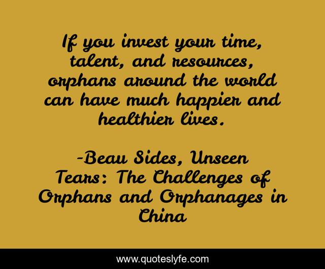 This page presents the quote "If you invest your time, talent, and resources, orphans around the world can have much happier and healthier lives.". Author of this quote is Beau Sides, Unseen Tears: The Challenges of Orphans and Orphanages in China. This quote is about talent, orphans, orphans-in-china, china, happiness, time, orphanages, adoption-and-attitude, resources,.