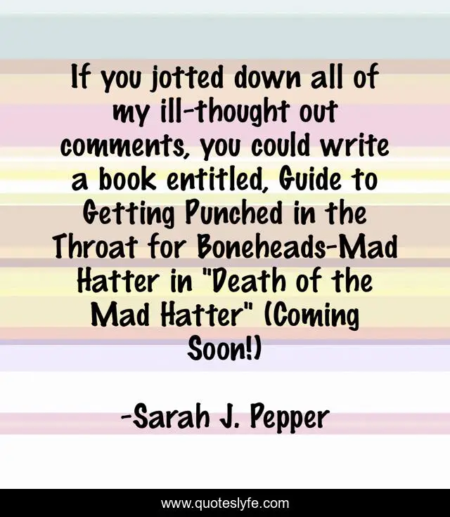 This page presents the quote "If you jotted down all of my ill-thought out comments, you could write a book entitled, Guide to Getting Punched in the Throat for Boneheads-Mad Hatter in "Death of the Mad Hatter" (Coming Soon!)". Author of this quote is Sarah J. Pepper. This quote is about teen, humor, science-fiction-romance, sarah-j-pepper, alice-in-wonderland, alice, paranormal, romance, wonderland,.