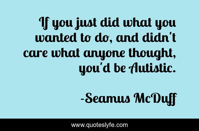 This page presents the quote "If you just did what you wanted to do, and didn't care what anyone thought, you'd be Autistic.". Author of this quote is Seamus McDuff. This quote is about freedom, self-belief, self-realization, pop-psychology, self-improvement, freethinking,.