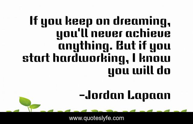 This page presents the quote "If you keep on dreaming, you'll never achieve anything. But if you start hardworking, I know you will do". Author of this quote is Jordan Lapaan. This quote is about life, inspirational, dreaming, enthusiasm, lesson, inspiration,.