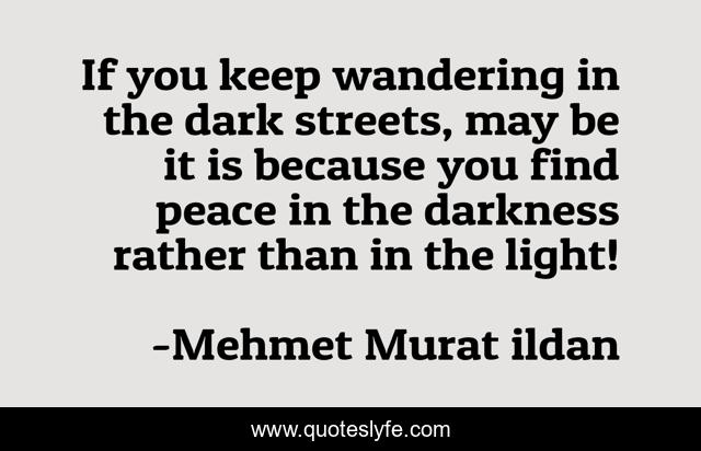 This page presents the quote "If you keep wandering in the dark streets, may be it is because you find peace in the darkness rather than in the light!". Author of this quote is Mehmet Murat ildan. This quote is about peace, darkness, light, streets, wander, dark-streets, wandering, wandering-soul, find-peace,.