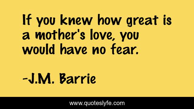 This page presents the quote "If you knew how great is a mother's love, you would have no fear.". Author of this quote is J.M. Barrie. This quote is about mother, mothers,.