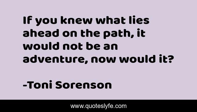 This page presents the quote "If you knew what lies ahead on the path, it would not be an adventure, now would it?". Author of this quote is Toni Sorenson. This quote is about path, life, adventure, fitness,.