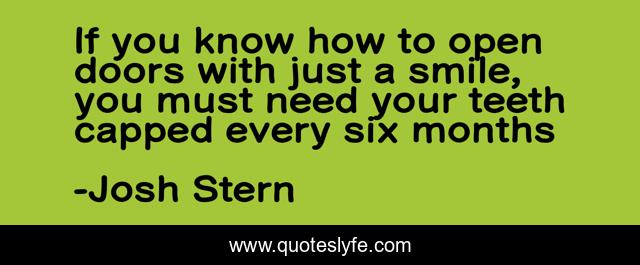 This page presents the quote "If you know how to open doors with just a smile, you must need your teeth capped every six months". Author of this quote is Josh Stern. This quote is about funny, crazy, funny-and-random, humor, romance, strange, passion, absurd, love,.