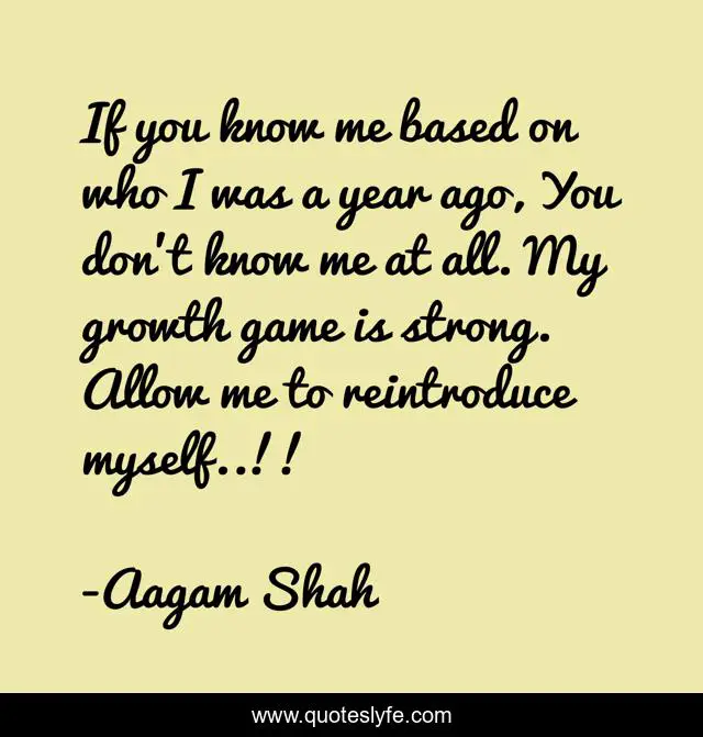 This page presents the quote "If you know me based on who I was a year ago, You don't know me at all. My growth game is strong. Allow me to reintroduce myself..!!". Author of this quote is Aagam Shah. This quote is about change-the-world, change-your-life, growth,.