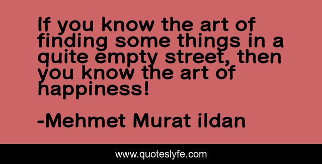 This page presents the quote "If you know the art of finding some things in a quite empty street, then you know the art of happiness!". Author of this quote is Mehmet Murat ildan. This quote is about happiness-life, turkish-aphorisms, art-of-happiness, art, mehmet-murat-ildan, ildan-wise-sayings, turkish, ildan-wisdom, turkish-sayings,.