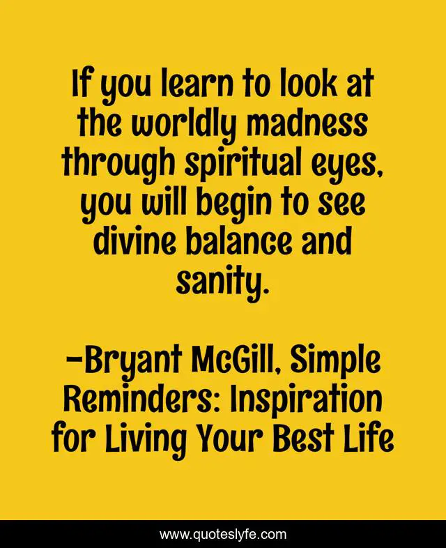 This page presents the quote "If you learn to look at the worldly madness through spiritual eyes, you will begin to see divine balance and sanity.". Author of this quote is Bryant McGill, Simple Reminders: Inspiration for Living Your Best Life. This quote is about spirituality, growth, learning,.