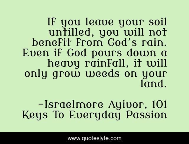 This page presents the quote "If you leave your soil untilled, you will not benefit from God’s rain. Even if God pours down a heavy rainfall, it will only grow weeds on your land.". Author of this quote is Israelmore Ayivor, 101 Keys To Everyday Passion. This quote is about rainfall, food-for-thought, farm, god, blessing, rain, quotes, weeds, personal-development,.
