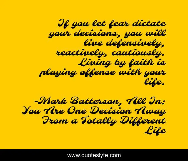 "Mark Batterson, All In: You Are One Decision Away From a Totally Different Life Quotes." Quoteslyfe.com, 2025. Sat. 06 Dec. 2025. <https://www.quoteslyfe.com/quote/If-you-let-fear-dictate-your-decisions-26625>.