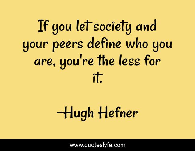 This page presents the quote "If you let society and your peers define who you are, you're the less for it.". Author of this quote is Hugh Hefner. This quote is about peers, define,.