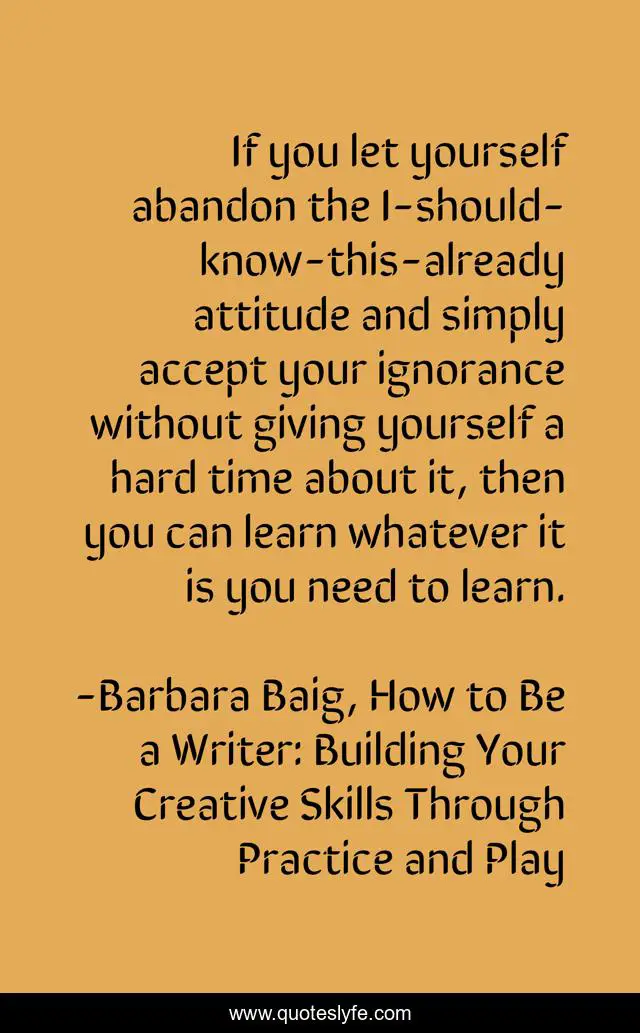 This page presents the quote "If you let yourself abandon the I-should-know-this-already attitude and simply accept your ignorance without giving yourself a hard time about it, then you can learn whatever it is you need to learn.". Author of this quote is Barbara Baig, How to Be a Writer: Building Your Creative Skills Through Practice and Play. .