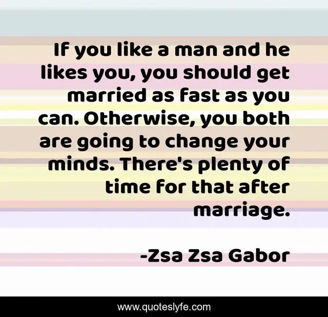 This page presents the quote "If you like a man and he likes you, you should get married as fast as you can. Otherwise, you both are going to change your minds. There's plenty of time for that after marriage.". Author of this quote is Zsa Zsa Gabor. This quote is about time, change, man,.