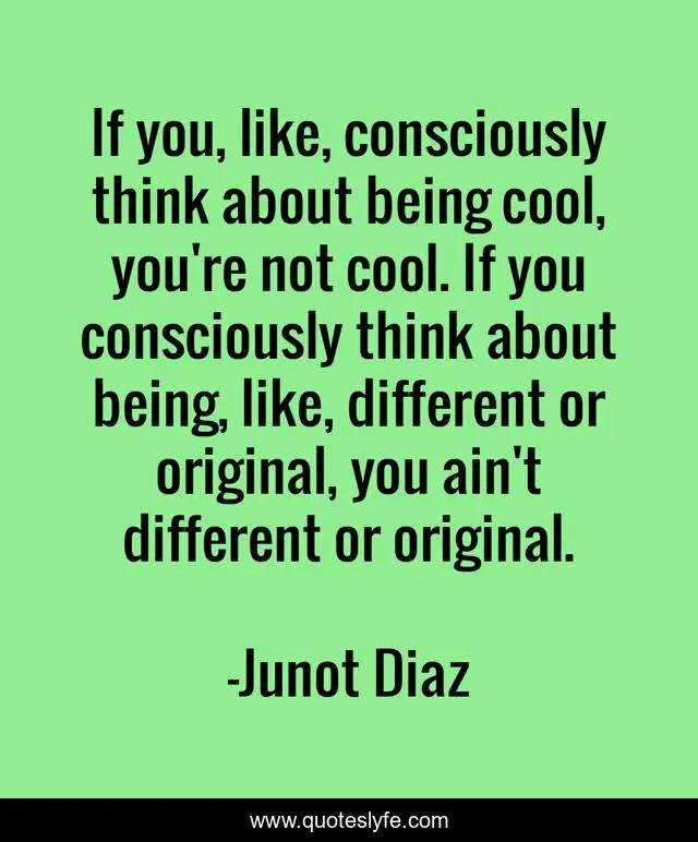 This page presents the quote "If you, like, consciously think about being cool, you're not cool. If you consciously think about being, like, different or original, you ain't different or original.". Author of this quote is Junot Diaz. This quote is about different, think,.