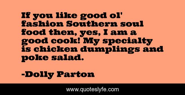 This page presents the quote "If you like good ol' fashion Southern soul food then, yes, I am a good cook! My specialty is chicken dumplings and poke salad.". Author of this quote is Dolly Parton. This quote is about good, soul,.
