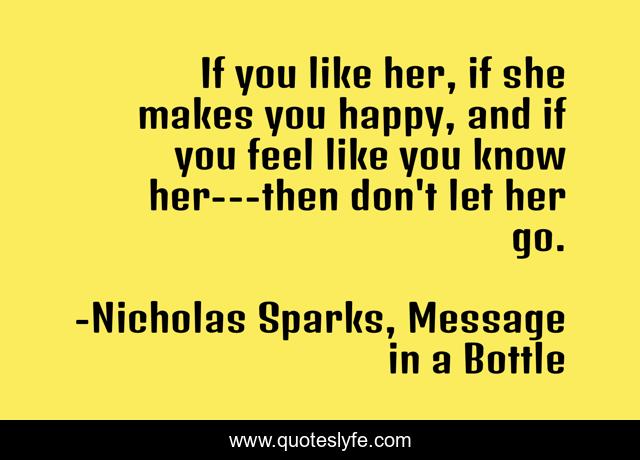 This page presents the quote "If you like her, if she makes you happy, and if you feel like you know her---then don't let her go.". Author of this quote is Nicholas Sparks, Message in a Bottle. This quote is about love, affection,.