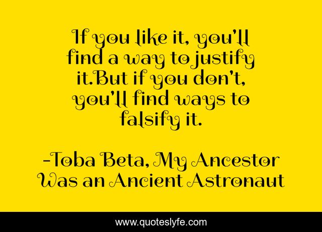 This page presents the quote "If you like it, you'll find a way to justify it.But if you don't, you'll find ways to falsify it.". Author of this quote is Toba Beta, My Ancestor Was an Ancient Astronaut. This quote is about relativity, ego, subjectivity,.