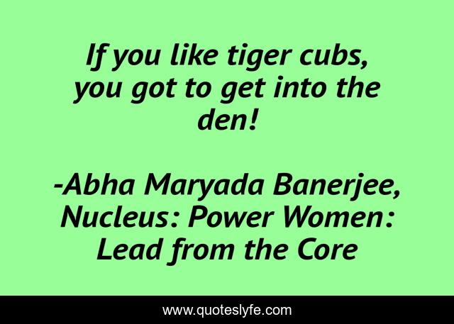 This page presents the quote "If you like tiger cubs, you got to get into the den!". Author of this quote is Abha Maryada Banerjee, Nucleus: Power Women: Lead from the Core. This quote is about leadership, risk, solutions,.