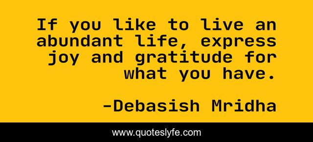 This page presents the quote "If you like to live an abundant life, express joy and gratitude for what you have.". Author of this quote is Debasish Mridha. This quote is about philosophy, express-joy, mridha, debasish, debasish-mridha, express-gratitude, inspirational, enthusiasm, abundant-life,.