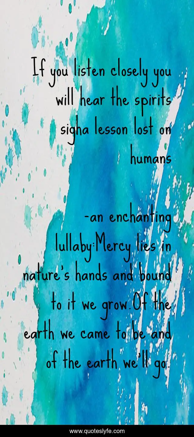 "an enchanting lullaby:Mercy lies in nature’s hands and bound to it we grow.Of the earth we came to be and of the earth we’ll go. Quotes." Quoteslyfe.com, 2025. Sat. 06 Dec. 2025. <https://www.quoteslyfe.com/quote/If-you-listen-closely-you-will-hear-72876>.