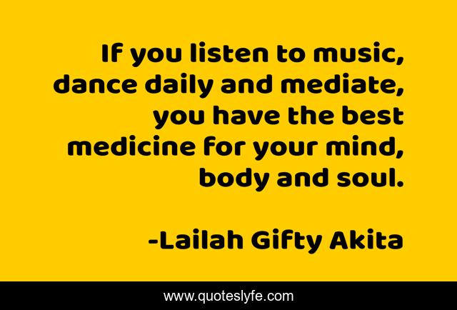 This page presents the quote "If you listen to music, dance daily and mediate, you have the best medicine for your mind, body and soul.". Author of this quote is Lailah Gifty Akita. This quote is about body-mind-spirit, mediation, music, healthy-living, self-help,.