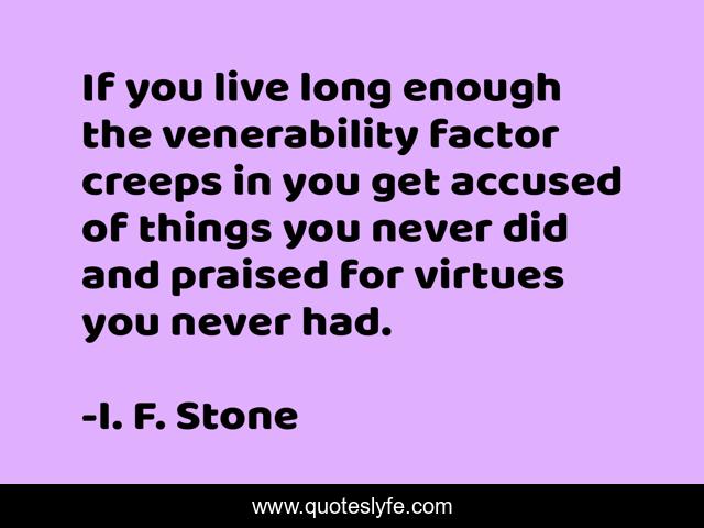 This page presents the quote "If you live long enough the venerability factor creeps in you get accused of things you never did and praised for virtues you never had.". Author of this quote is I. F. Stone. This quote is about aging, age, old,.