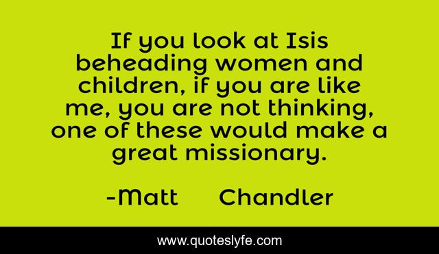 This page presents the quote "If you look at Isis beheading women and children, if you are like me, you are not thinking, one of these would make a great missionary.". Author of this quote is Matt Chandler. This quote is about forgiveness, regeneration, ministry,.