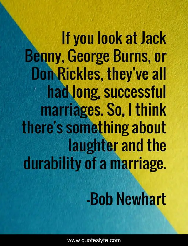 This page presents the quote "If you look at Jack Benny, George Burns, or Don Rickles, they've all had long, successful marriages. So, I think there's something about laughter and the durability of a marriage.". Author of this quote is Bob Newhart. This quote is about successful, laughter, long,.