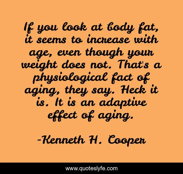 This page presents the quote "If you look at body fat, it seems to increase with age, even though your weight does not. That's a physiological fact of aging, they say. Heck it is. It is an adaptive effect of aging.". Author of this quote is Kenneth H. Cooper. This quote is about body, aging, fat,.