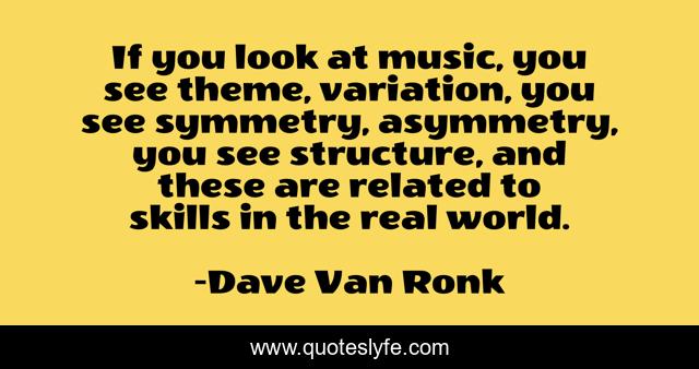 This page presents the quote "If you look at music, you see theme, variation, you see symmetry, asymmetry, you see structure, and these are related to skills in the real world.". Author of this quote is Dave Van Ronk. This quote is about world, see,.