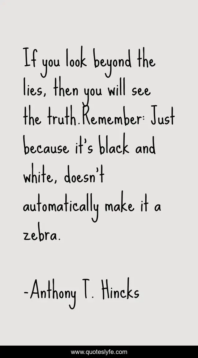 This page presents the quote "If you look beyond the lies, then you will see the truth.Remember: Just because it's black and white, doesn't automatically make it a zebra.". Author of this quote is Anthony T. Hincks. This quote is about black-and-white, philosophy, lies, black, zebra, truth, white,.