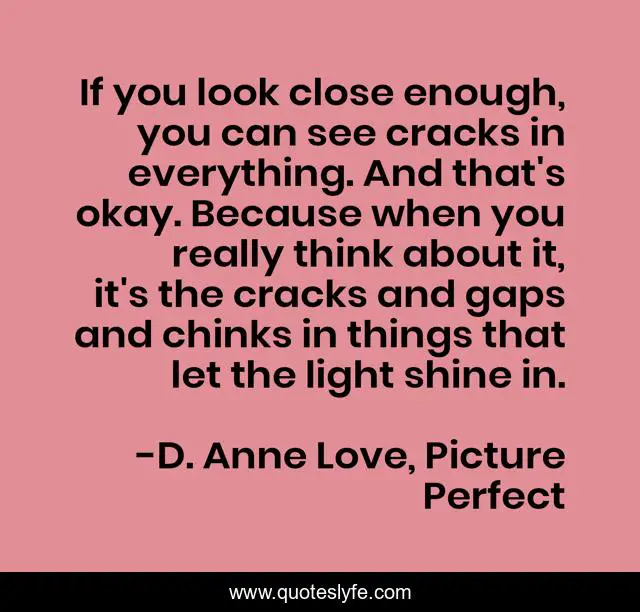 This page presents the quote "If you look close enough, you can see cracks in everything. And that's okay. Because when you really think about it, it's the cracks and gaps and chinks in things that let the light shine in.". Author of this quote is D. Anne Love, Picture Perfect. .