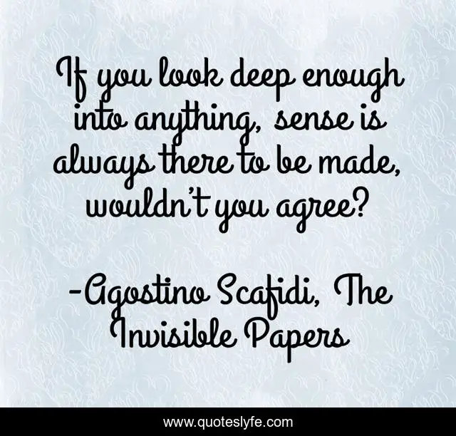 This page presents the quote "If you look deep enough into anything, sense is always there to be made, wouldn’t you agree?". Author of this quote is Agostino Scafidi, The Invisible Papers. This quote is about quote, philosophy, question, pondering, quotes,.