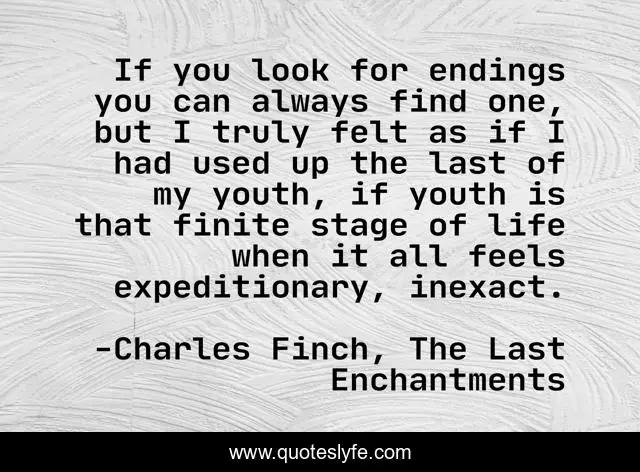This page presents the quote "If you look for endings you can always find one, but I truly felt as if I had used up the last of my youth, if youth is that finite stage of life when it all feels expeditionary, inexact.". Author of this quote is Charles Finch, The Last Enchantments. This quote is about youth, growing-up, endings,.