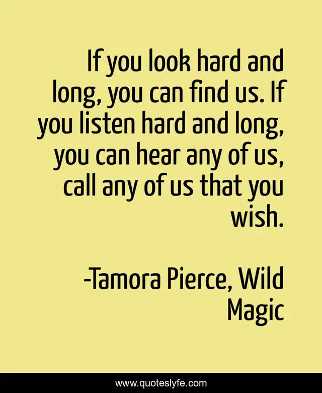 This page presents the quote "If you look hard and long, you can find us. If you listen hard and long, you can hear any of us, call any of us that you wish.". Author of this quote is Tamora Pierce, Wild Magic. This quote is about magic, communication, daine, calling, call, hearing, badger,.