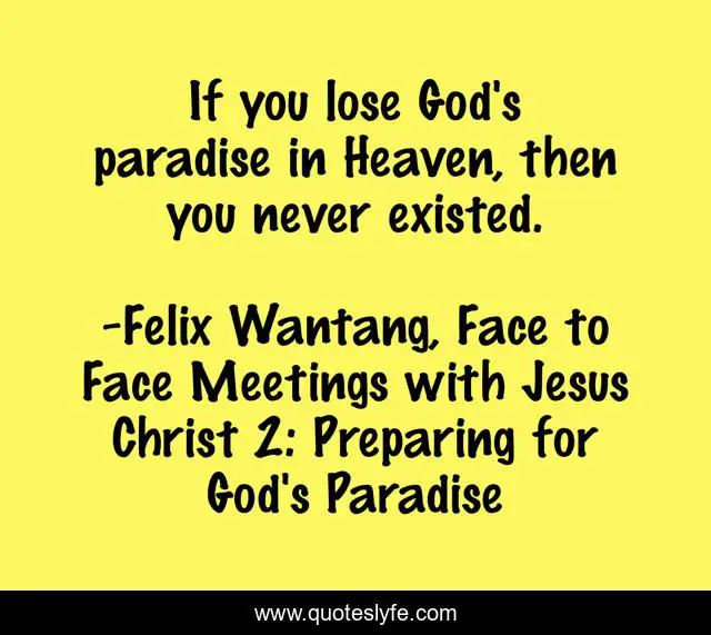 This page presents the quote "If you lose God's paradise in Heaven, then you never existed.". Author of this quote is Felix Wantang, Face to Face Meetings with Jesus Christ 2: Preparing for God's Paradise. This quote is about jesus, god, heaven, christ, paradise,.
