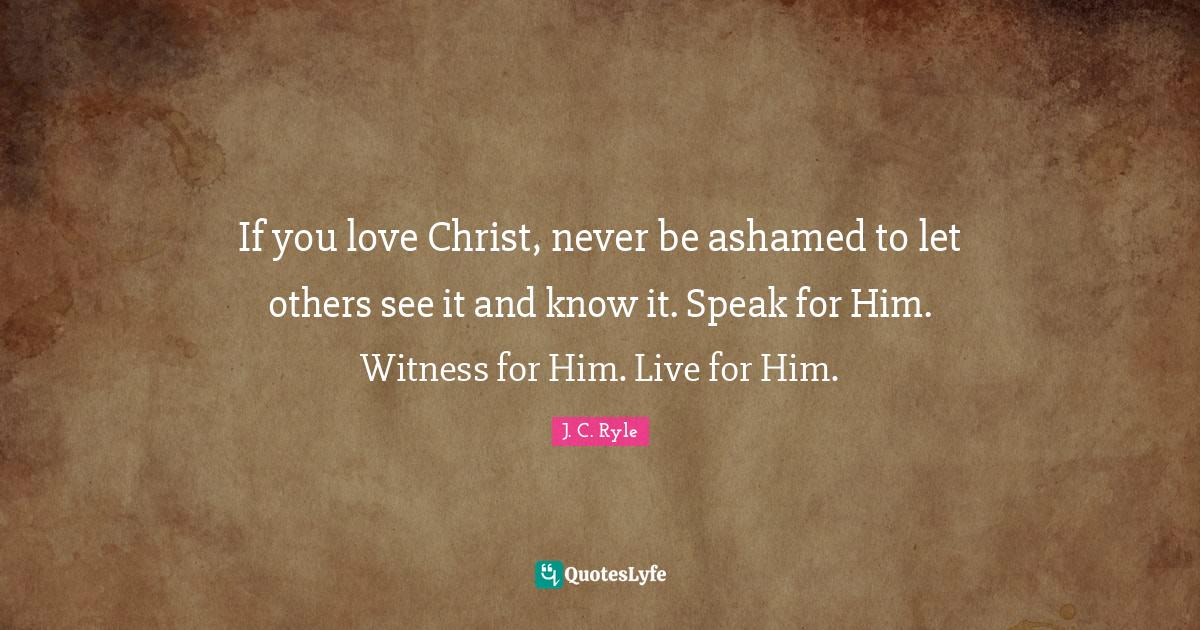 This page presents the quote "If you love Christ, never be ashamed to let others see it and know it. Speak for Him. Witness for Him. Live for Him.". Author of this quote is J. C. Ryle. This quote is about speak, affection, christ, witness, ashamed, love,.