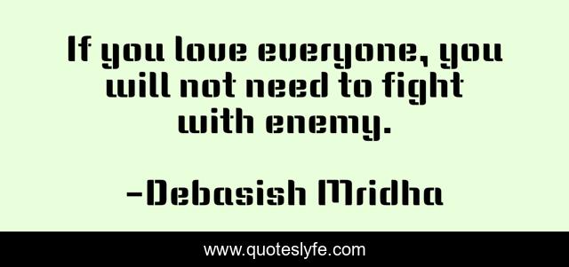 This page presents the quote "If you love everyone, you will not need to fight with enemy.". Author of this quote is Debasish Mridha. This quote is about life, love, knowledge, inspirational, intelligence, philosophy, wisdom, quotes, affection,.
