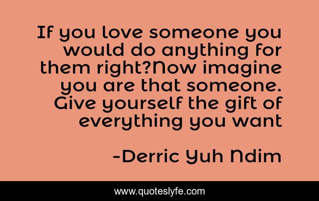 This page presents the quote "If you love someone you would do anything for them right?Now imagine you are that someone. Give yourself the gift of everything you want". Author of this quote is Derric Yuh Ndim. This quote is about thinking, actions, believes, unlocking-your-true-potential, values, inspirational-for-writers, personal-development, inspirational-success-failure, inspiration,.