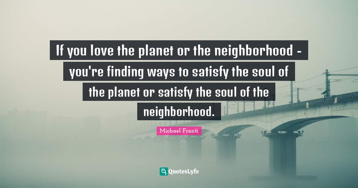 This page presents the quote "If you love the planet or the neighborhood - you're finding ways to satisfy the soul of the planet or satisfy the soul of the neighborhood.". Author of this quote is Michael Franti. This quote is about soul, neighborhood, way, affection, planets, love,.