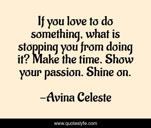 This page presents the quote "If you love to do something, what is stopping you from doing it? Make the time. Show your passion. Shine on.". Author of this quote is Avina Celeste. This quote is about shine, confidence, positive, motivational, passion, optimistic, inspirational, enthusiasm,.