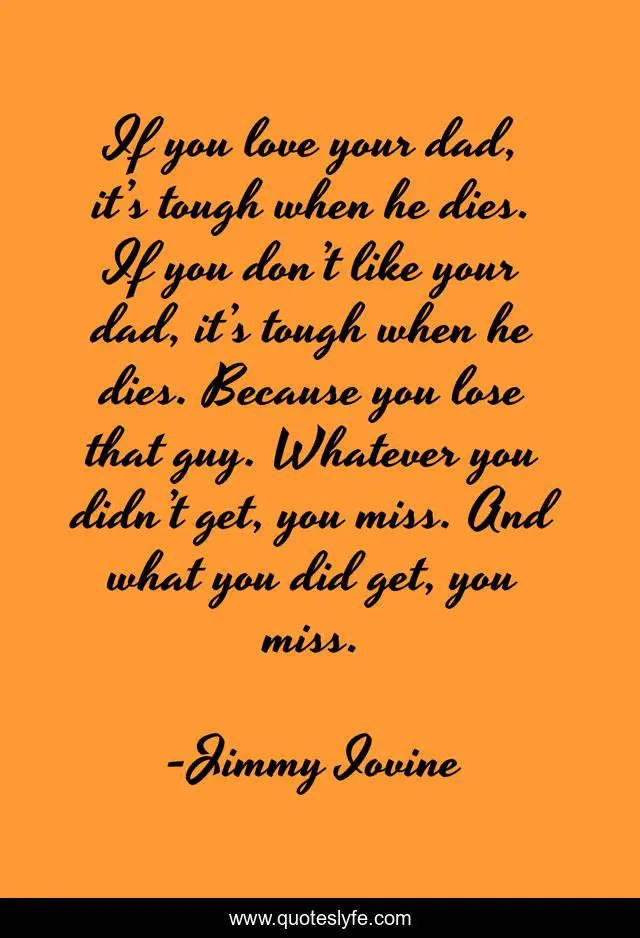 This page presents the quote "If you love your dad, it’s tough when he dies. If you don’t like your dad, it’s tough when he dies. Because you lose that guy. Whatever you didn’t get, you miss. And what you did get, you miss.". Author of this quote is Jimmy Iovine. This quote is about dad, loss, death-of-a-parent,.