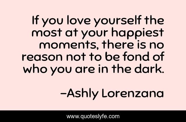 This page presents the quote "If you love yourself the most at your happiest moments, there is no reason not to be fond of who you are in the dark.". Author of this quote is Ashly Lorenzana. This quote is about love, depression, happiness, self-awareness, affection, perspective,.
