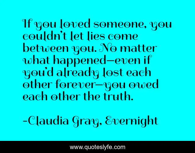 This page presents the quote "If you loved someone, you couldn’t let lies come between you. No matter what happened—even if you’d already lost each other forever—you owed each other the truth.". Author of this quote is Claudia Gray, Evernight. .