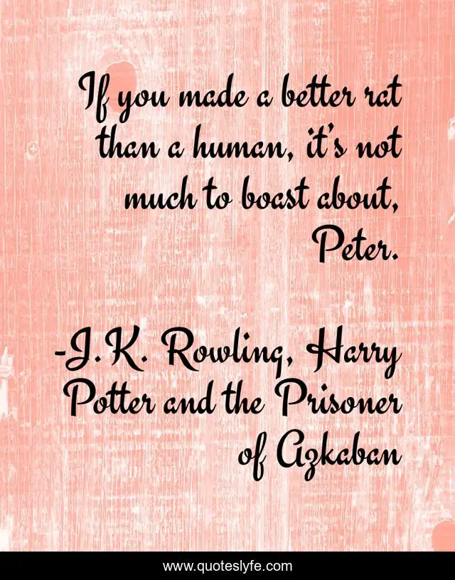 This page presents the quote "If you made a better rat than a human, it’s not much to boast about, Peter.". Author of this quote is J.K. Rowling, Harry Potter and the Prisoner of Azkaban. This quote is about rat, accomplishments, peter-pettigrew, human,.