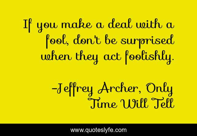 This page presents the quote "If you make a deal with a fool, don't be surprised when they act foolishly.". Author of this quote is Jeffrey Archer, Only Time Will Tell. This quote is about philosophical, humor,.
