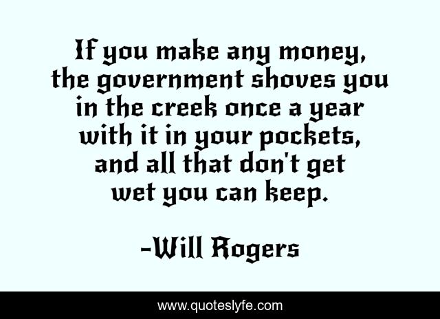 This page presents the quote "If you make any money, the government shoves you in the creek once a year with it in your pockets, and all that don't get wet you can keep.". Author of this quote is Will Rogers. This quote is about money, year,.