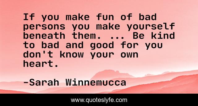 This page presents the quote "If you make fun of bad persons you make yourself beneath them. ... Be kind to bad and good for you don't know your own heart.". Author of this quote is Sarah Winnemucca. This quote is about positive, confidence,.